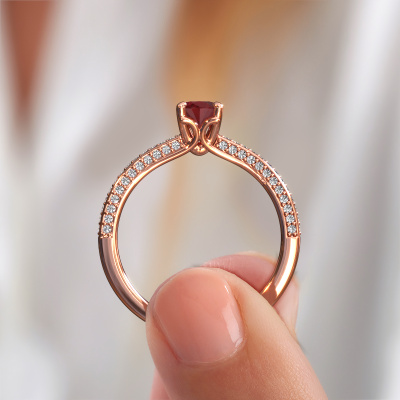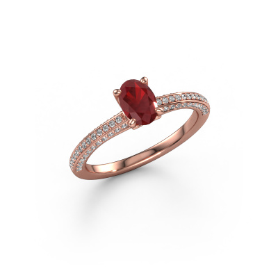 The ring shown above is called the Elenore ovl. We call this type of ring a pavé solitaire ring because it has one centre gemstone and a band that is also pave set with gemstones. This engagement ring is made in 14 Carat rose gold set with a 6.5x4.5 mm oval ruby, and pave set diamonds at the sides. Each piece of jewellery is made by a team of passionate goldsmiths and jewel designers. This will make your crown jewel truly eye-catching.This exclusive rose gold pavé solitaire engagement ring has an exquisite oval ruby centre stone. To further accentuate the centre stone, the band is set full with more diamonds. Its open prong setting allows light to strike the ruby from various angles and this adds sparkle to your ruby ring. The photo shown above depicts the goldsmith's carefully handcrafted details of the ring. The high positioning of the centre stone is truly eye-catching. The perfect engagement ring for the crown jewel of your life!After receiving your order, our goldsmiths will start the creative process of making your Elenore ovl engagement ring. We don't keep stock. This is advantageous because these costs will not be passed on to you. Therefore, we can offer jewellery at exceptionally low prices.Have you found a specific engagement ring somewhere which you would like to give to your loved one? Please feel free to express your wishes to our jewel designers because we would be honoured to turn your design into a exclusive engagement ring. You can follow the development of your ring design because we use 3D drawings. This gives you a realistic preview of how your design will look. You can also preorder a dummy. A dummy is a plastic ring, which can be shaped according your ring design. You can try it on and check if its width and size are suitable for you. We will gladly send you a non-binding offer, based on a fair price/ quality ratio. It will amaze you, considering the quality of the ring and gemstones.To make it easier for you, we offer a 30 day return policy. Check our terms and conditions.