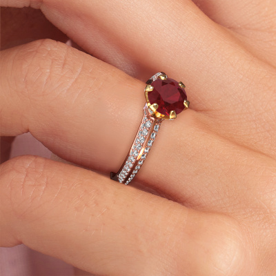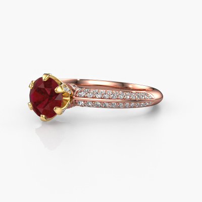 The ring shown above is called the Abby. We call this type of ring a pavé solitaire ring because it has one centre gemstone and a band that is also pave set with gemstones. The 14 Carat rose gold engagement ring is set with a round 6.5 mm ruby centre stone and the band is pave set with diamond gemstones. Each jewel is made just for you by our master goldsmiths in our own studio.This exclusive rose gold pavé solitaire engagement ring has an exquisite round ruby centre stone. To further accentuate the centre stone, the band is fully set with more diamonds. Its open prong setting allows light to strike the ruby from various angles and this adds sparkle to your ruby ring. The photo shown above depicts the goldsmith's carefully handcrafted details of the ring. The high positioning of the centre stone is truly eye-catching. The perfect engagement ring for the crown jewel of your life! Are you on a budget? Please feel free to contact us, so we can go discuss your options. We offer our engagement rings at guaranteed best price, because we make them to order. You won't find such a price anywhere else!Our team adds new designs to our online collection daily. Our designers and goldsmiths work together in creating the best design. We strive to offer a diverse collection of jewels. Perhaps you have a specific jewel design in mind. One you came across somewhere. Please contact us for a free consultation. We will make you an offer, based on a fair price/ quality ratio, that will baffle you.To make it easier for you, we offer a 30 day return policy. Check our terms and conditions.