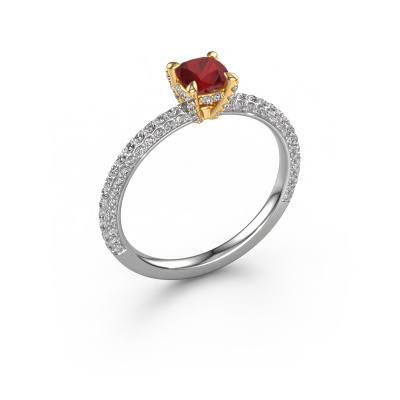 The ring shown above is called the Saskia 2 cus. We call this type of ring a pavé solitaire ring because it has one centre gemstone and a band that is also pave set with gemstones. The 14 Carat white gold engagement ring is set with a cushion 4.5 mm ruby centre stone and the band is pave set with lab grown diamond gemstones. Each jewel is made just for you, with attention to detail and design.This contemporary white gold pavé solitaire engagement ring has an exquisite cushion ruby centre stone. To further accentuate the centre stone, the band is fully set with more lab-grown diamonds. Its open prong setting allows light to strike the ruby from various angles and this adds sparkle to your ruby ring. The photo shown above depicts the goldsmith's carefully handcrafted details of the ring. The high positioning of the centre stone is truly eye-catching. The perfect engagement ring for the crown jewel of your life! Are you on a budget? Please feel free to contact us, so we can go discuss your options. We offer our engagement rings at guaranteed best price, because we make them to order. You won't find such a price anywhere else!Our designers and goldsmiths work together each day, creating new jewels. Perhaps you have found a nice contemporary engagement ring somewhere, which can be used to customize your unique ring. Please feel free to contact us. We will make you an offer, based on a fair price/ quality ratio, which will amaze you.To make it easier for you, we offer a 30 day return policy. Check our terms and conditions.