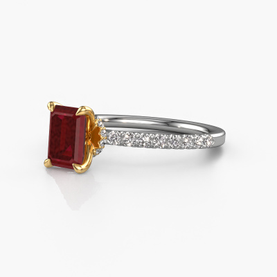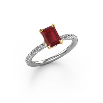 The ring shown above is called the Crystal EME 4. We call this type of ring a pavé solitaire ring because it has one centre gemstone and a band that is also pave set with gemstones. The 14 Carat white gold engagement ring is set with a emerald cut 7x5 mm ruby centre stone and the band is pave set with lab grown diamond gemstones. Each jewel is created to add sparkle to your finger, each jewel is lovingly made by hand by our goldsmiths.This fashionable white gold pavé solitaire engagement ring has an exquisite emerald cut ruby centre stone. To further accentuate the centre stone, the band is fully set with more lab-grown diamonds. Its open prong setting allows light to strike the ruby from various angles and this adds sparkle to your ruby ring. The photo shown above depicts the goldsmith's carefully handcrafted details of the ring. The high positioning of the centre stone is truly eye-catching. The perfect engagement ring for the crown jewel of your life! After receiving your order, our goldsmiths will passionately start the creative process of making your engagement ring in our own studio. Because we don't have a big stockpile, these costs will not be passed on to you. Our pricing is proof of that! We offer top quality jewels at lowest price, guaranteed.Our team adds new designs to our online collection daily. Our designers and goldsmiths work together in creating the best design. We strive to offer a diverse collection of jewels. Perhaps you have a specific jewel design in mind. One you came across somewhere. Please contact us for a free consultation. We will make you an offer, based on a fair price/ quality ratio, that will baffle you.To make it easier for you, we offer a 30 day return policy. Check our terms and conditions.