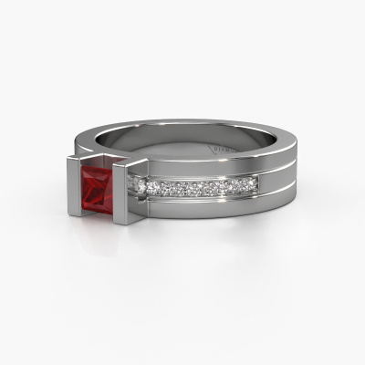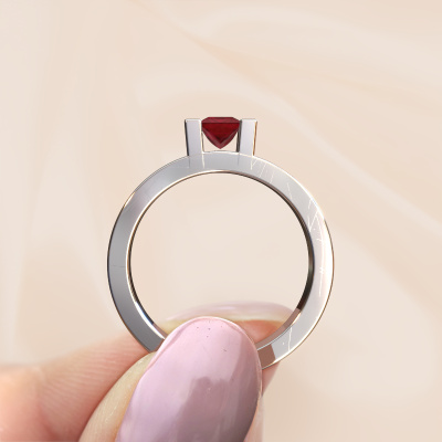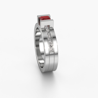 The ring shown above is called the Desire. We call this type of ring a pavé solitaire ring because it has one centre gemstone and a band that is also pave set with gemstones. The 14 Carat white gold engagement ring is set with a princess 4 mm ruby centre stone and the band is pave set with diamond gemstones. Each jewel is made just for you by our master goldsmiths in our own studio.This modern white gold pavé solitaire engagement ring has an exquisite princess ruby centre stone. To further accentuate the centre stone, the band is fully set with more diamonds. Its open prong setting allows light to strike the ruby from various angles and this adds sparkle to your ruby ring. The photo shown above depicts the goldsmith's carefully handcrafted details of the ring. The high positioning of the centre stone is truly eye-catching. The perfect engagement ring for the crown jewel of your life! By using a combination of the latest modern techniques, combined with ancient crafting, we can make all our engagement rings in our own studio. Each jewel is made to order. This is advantageous because we can offer you a price you won't find anywhere else.Have you found a specific engagement ring somewhere which you would like to give to your loved one? Please feel free to express your wishes to our jewel designers because we would be honoured to turn your design into a modern engagement ring. You can follow the development of your ring design because we use 3D drawings. This gives you a realistic preview of how your design will look. You can also preorder a dummy. A dummy is a plastic ring, which can be shaped according your ring design. You can try it on and check if its width and size are suitable for you. We will gladly send you a non-binding offer, based on a fair price/ quality ratio. It will amaze you, considering the quality of the ring and gemstones.To make it easier for you, we offer a 30 day return policy. Check our terms and conditions.