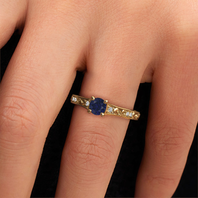 The ring shown above is called the Mallory rnd. We call this type of ring a pavé solitaire ring because it has one centre gemstone and a band that is also pave set with gemstones. This engagement ring is made in 14 Carat gold set with a 5 mm round sapphire, and pave set lab-grown diamonds at the sides. Each piece of jewellery is made just for you by our master goldsmiths in our own studio.This vintage gold pavé solitaire engagement ring has an exquisite round sapphire centre stone. To further accentuate the centre stone, the band is set full with more lab-grown diamonds. Its open prong setting allows light to strike the sapphire from various angles and this adds sparkle to your sapphire ring. The photo shown above depicts the goldsmith's carefully handcrafted details of the ring. The high positioning of the centre stone is truly eye-catching. The perfect engagement ring for the crown jewel of your life!Because we design and deliver our own rings, we can offer you a engagement ring at a price you won't find anywhere else. A ring is made to order, which helps prevent excess supplies, so we can make you a great price offer. We understand it feels risky, buying your engagement ring online, but we will gladly assist in the designing process, taking your budget into consideration.Different styles of new rings are made daily by our team. Perhaps you have found a pavé solitaire engagement ring somewhere. One you would like to give to your loved one. Please feel free to share your thoughts and design with our jewel designers. We would love to turn your design into a vintage engagement ring. You can follow the development of your ring design because we use very detailed 3D drawings. On top of that, you can order a dummy of the design. A dummy is a plastic ring, which can be shaped according your ring design. You can try it on and check if the engagement ring is up to standard. We will gladly send you a non-binding offer, based on a fair price/ quality ratio. The offer will baffle you, considering the quality of the ring and gemstones.To make it easier for you, we offer a 30 day return policy. Check our terms and conditions.