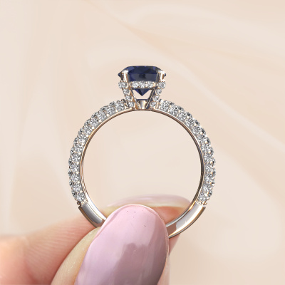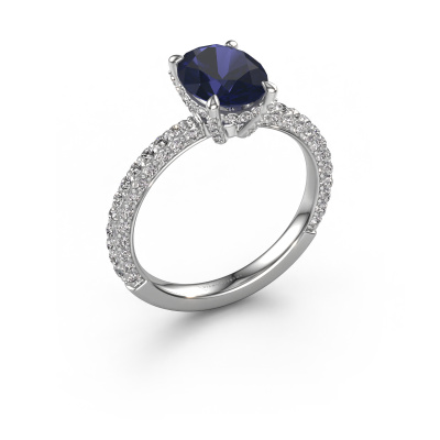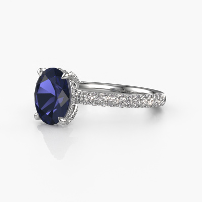 The ring shown above is called the Saskia 2 ovl. We call this type of ring a pavé solitaire ring because it has one centre gemstone and a band that is also pave set with gemstones. The platinum engagement ring is set with a oval 9x7 mm sapphire centre stone and the band is pave set with lab grown diamond gemstones. Each jewel is made just for you by our master goldsmiths in our own studio.This exclusive platinum pavé solitaire engagement ring has an exquisite oval sapphire centre stone. To further accentuate the centre stone, the band is fully set with more lab-grown diamonds. Its open prong setting allows light to strike the sapphire from various angles and this adds sparkle to your sapphire ring. The photo shown above depicts the goldsmith's carefully handcrafted details of the ring. The high positioning of the centre stone is truly eye-catching. The perfect engagement ring for the crown jewel of your life! After receiving your order, our goldsmiths will passionately start the creative process of making your engagement ring in our own studio. Because we don't have a big stockpile, these costs will not be passed on to you. Our pricing is proof of that! We offer top quality jewels at lowest price, guaranteed.Have you found a specific engagement ring somewhere which you would like to give to your loved one? Please feel free to express your wishes to our jewel designers because we would be honoured to turn your design into a exclusive engagement ring. You can follow the development of your ring design because we use 3D drawings. This gives you a realistic preview of how your design will look. You can also preorder a dummy. A dummy is a plastic ring, which can be shaped according your ring design. You can try it on and check if its width and size are suitable for you. We will gladly send you a non-binding offer, based on a fair price/ quality ratio. It will amaze you, considering the quality of the ring and gemstones.To make it easier for you, we offer a 30 day return policy. Check our terms and conditions.