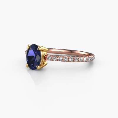 The ring shown above is called the Lynelle 2. We call this type of ring a pavé solitaire ring because it has one centre gemstone and a band that is also pave set with gemstones. This engagement ring is made in 14 Carat rose gold set with a 7x5 mm oval sapphire, and pave set diamonds at the sides. Each piece of jewellery is created to add sparkle to your finger, each jewel is lovingly made by hand by our goldsmiths.This classic rose gold pavé solitaire engagement ring has an exquisite oval sapphire centre stone. To further accentuate the centre stone, the band is set full with more diamonds. Its open prong setting allows light to strike the sapphire from various angles and this adds sparkle to your sapphire ring. The photo shown above depicts the goldsmith's carefully handcrafted details of the ring. The high positioning of the centre stone is truly eye-catching. The perfect engagement ring for the crown jewel of your life!After receiving your order, our goldsmiths will start the creative process of making your Lynelle 2 engagement ring. We don't keep stock. This is advantageous because these costs will not be passed on to you. Therefore, we can offer jewellery at exceptionally low prices.Do you have a specific ring in mind? One you came across somewhere. Please feel free to tell us your wishes and we will turn your design into a unique engagement ring. You can follow the development of your ring design because we use 3D drawings. This gives you a realistic preview of your design. We will gladly send you a non-binding offer, based on a fair price/ quality ratio. It will amaze you.To make it easier for you, we offer a 30 day return policy. Check our terms and conditions.