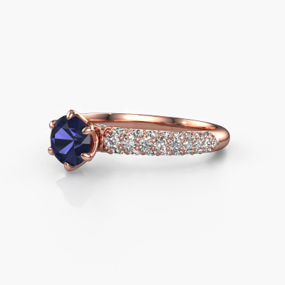 The ring shown above is called the Meryl. We call this type of ring a pavé solitaire ring because it has one centre gemstone and a band that is also pave set with gemstones. This engagement ring is made in 14 Carat rose gold set with a 5.7 mm round sapphire, and pave set diamonds at the sides. Each piece of jewellery is made just for you, with attention to detail and design.This exclusive rose gold pavé solitaire engagement ring has an exquisite round sapphire centre stone. To further accentuate the centre stone, the band is set full with more diamonds. Its open prong setting allows light to strike the sapphire from various angles and this adds sparkle to your sapphire ring. The photo shown above depicts the goldsmith's carefully handcrafted details of the ring. The high positioning of the centre stone is truly eye-catching. The perfect engagement ring for the crown jewel of your life!After receiving your order, our goldsmiths will passionately start the creative process of making your engagement ring in our own studio. Because we don't have a big stockpile, these costs will not be passed on to you. Our pricing is proof of that! We offer top quality jewels at lowest price, guaranteed.Have you found a specific engagement ring somewhere which you would like to give to your loved one? Please feel free to express your wishes to our jewel designers because we would be honoured to turn your design into a exclusive engagement ring. You can follow the development of your ring design because we use 3D drawings. This gives you a realistic preview of how your design will look. You can also preorder a dummy. A dummy is a plastic ring, which can be shaped according your ring design. You can try it on and check if its width and size are suitable for you. We will gladly send you a non-binding offer, based on a fair price/ quality ratio. It will amaze you, considering the quality of the ring and gemstones.To make it easier for you, we offer a 30 day return policy. Check our terms and conditions.