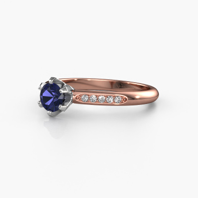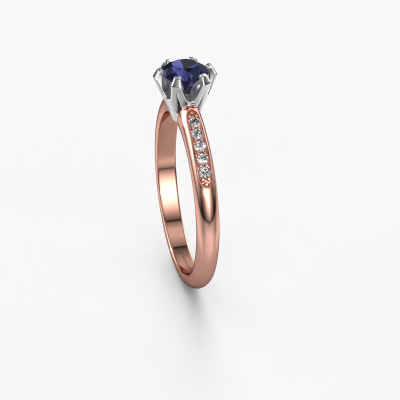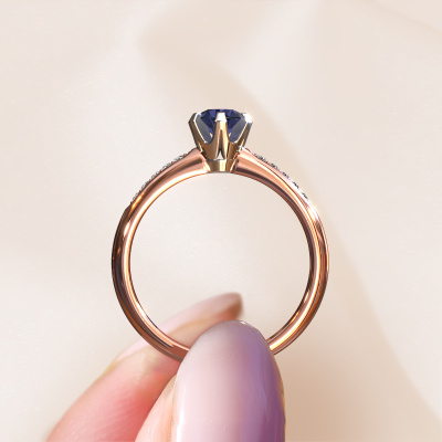 The ring shown above is called the Tiffy 2. We call this type of ring a pavé solitaire ring because it has one centre gemstone and a band that is also pave set with gemstones. This engagement ring is made in 14 Carat rose gold set with a 4.7 mm round sapphire, and pave set diamonds at the sides. Each piece of jewellery is created to add sparkle to your finger, each jewel is lovingly made by hand by our goldsmiths.This traditional rose gold pavé solitaire engagement ring has an exquisite round sapphire centre stone. To further accentuate the centre stone, the band is set full with more diamonds. Its open prong setting allows light to strike the sapphire from various angles and this adds sparkle to your sapphire ring. The photo shown above depicts the goldsmith's carefully handcrafted details of the ring. The high positioning of the centre stone is truly eye-catching. The perfect engagement ring for the crown jewel of your life!By using our modern techniques, we can design and customize the finest quality jewels with the utmost care for you. Our engagement rings are always priced 30 percent lower than other jewellers. We make engagement rings to order so we don't have to maintain a large stock. If you have a certain budget, we are more than happy to advice you accordingly.Our designers and goldsmiths work together each day, creating new jewels. Perhaps you have found a nice traditional engagement ring somewhere, which can be used to customize your unique ring. Please feel free to contact us. We will make you an offer, based on a fair price/ quality ratio, which will amaze you.To make it easier for you, we offer a 30 day return policy. Check our terms and conditions.