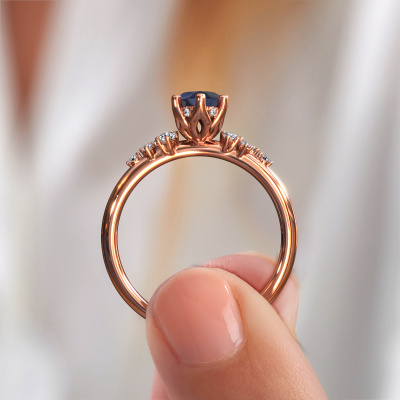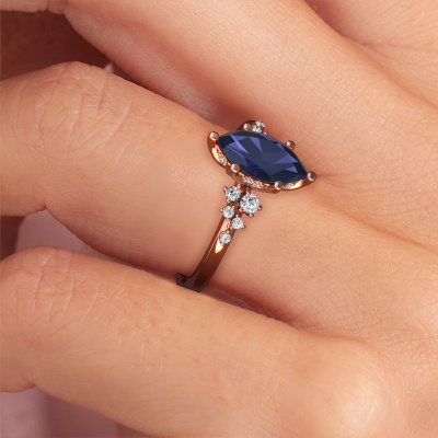 This 14 Carat rose gold ring is called Emma MRQ and is set with sapphire. How would you describe the style of the love of your life? Does she have a unique sense of style? This stunning special rose gold engagement ring can be custom-made to your