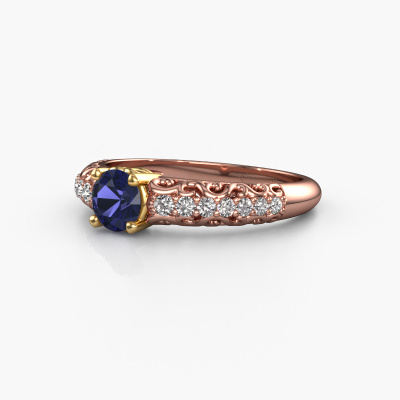 This 14 Carat rose gold ring is called Mellie and is set with 5 mm sapphire. What is it that makes your relationship unique? What is it about her that makes you want to bend down on one knee? The unique bond between the two of you is emphasized by an equally unique ring. A one of a kind filigree pavé solitaire engagement ring made especially for her. That is why this vintage ring fits her like a glove. Each specific detail of this filigree rose gold sapphire set engagement ring is hand-picked, crafted and polished by our expert goldsmith. The result is an exquisite ring, unique and perfectly crafted to perfection. That is what our expert Goldsmiths strive for. This jewel is made by a team of passionate goldsmiths and jewel designers. This will make your crown jewel truly eye-catching.Are you on a budget? Please feel free to contact us, so we can go discuss your options. We offer our engagement rings at guaranteed best price, because we make them to order. You won't find such a price anywhere else!Have you found a specific engagement ring somewhere which you would like to give to your loved one? Please feel free to express your wishes to our jewel designers because we would be honoured to turn your design into a vintage engagement ring. You can follow the development of your ring design because we use 3D drawings. This gives you a realistic preview of how your design will look. You can also preorder a dummy. A dummy is a plastic ring, which can be shaped according your ring design. You can try it on and check if its width and size are suitable for you. We will gladly send you a non-binding offer, based on a fair price/ quality ratio. It will amaze you, considering the quality of the ring and gemstones.To make it easier for you, we offer a 30 day return policy. Check our terms and conditions.