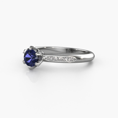 The ring shown above is called the Tiffy 2. We call this type of ring a pavé solitaire ring because it has one centre gemstone and a band that is also pave set with gemstones. This engagement ring is made in 14 Carat white gold set with a 4.7 mm round sapphire, and pave set diamonds at the sides. Each piece of jewellery is created to add sparkle to your finger, each jewel is lovingly made by hand by our goldsmiths.This traditional white gold pavé solitaire engagement ring has an exquisite round sapphire centre stone. To further accentuate the centre stone, the band is set full with more diamonds. Its open prong setting allows light to strike the sapphire from various angles and this adds sparkle to your sapphire ring. The photo shown above depicts the goldsmith's carefully handcrafted details of the ring. The high positioning of the centre stone is truly eye-catching. The perfect engagement ring for the crown jewel of your life!By using our modern techniques, we can design and customize the finest quality jewels with the utmost care for you. Our engagement rings are always priced 30 percent lower than other jewellers. We make engagement rings to order so we don't have to maintain a large stock. If you have a certain budget, we are more than happy to advice you accordingly.Our designers and goldsmiths work together each day, creating new jewels. Perhaps you have found a nice traditional engagement ring somewhere, which can be used to customize your unique ring. Please feel free to contact us. We will make you an offer, based on a fair price/ quality ratio, which will amaze you.To make it easier for you, we offer a 30 day return policy. Check our terms and conditions.