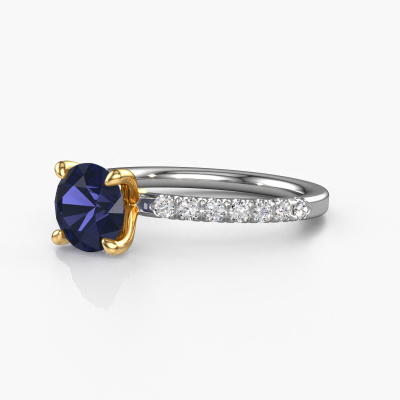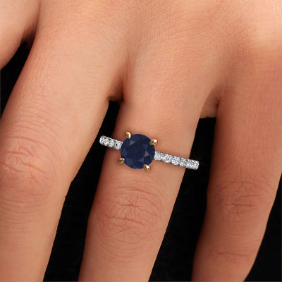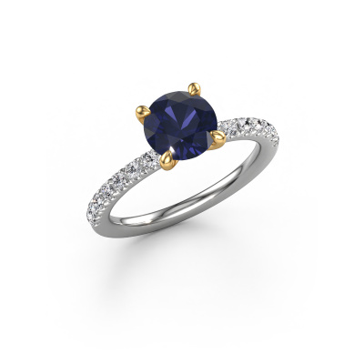 The ring shown above is called the Crystal RND 2. We call this type of ring a pavé solitaire ring because it has one centre gemstone and a band that is also pave set with gemstones. The 14 Carat white gold engagement ring is set with a round 7 mm sapphire centre stone and the band is pave set with lab grown diamond gemstones. Each jewel is unique in every way! Simply customize to your liking,This classic white gold pavé solitaire engagement ring has an exquisite round sapphire centre stone. To further accentuate the centre stone, the band is fully set with more lab-grown diamonds. Its open prong setting allows light to strike the sapphire from various angles and this adds sparkle to your sapphire ring. The photo shown above depicts the goldsmith's carefully handcrafted details of the ring. The high positioning of the centre stone is truly eye-catching. The perfect engagement ring for the crown jewel of your life! After receiving your order, our goldsmiths will start the creative process of making your Crystal RND 2 engagement ring. We don't keep stock. This is advantageous because these costs will not be passed on to you. Therefore, we can offer jewellery at exceptionally low prices.Different styles of new rings are made daily by our team. Perhaps you have found a pavé solitaire engagement ring somewhere. One you would like to give to your loved one. Please feel free to share your thoughts and design with our jewel designers. We would love to turn your design into a classic engagement ring. You can follow the development of your ring design because we use very detailed 3D drawings. On top of that, you can order a dummy of the design. A dummy is a plastic ring, which can be shaped according your ring design. You can try it on and check if the engagement ring is up to standard. We will gladly send you a non-binding offer, based on a fair price/ quality ratio. The offer will baffle you, considering the quality of the ring and gemstones.To make it easier for you, we offer a 30 day return policy. Check our terms and conditions.