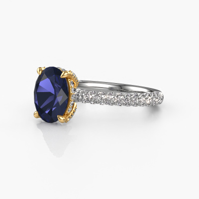 The ring shown above is called the Saskia 2 ovl. We call this type of ring a pavé solitaire ring because it has one centre gemstone and a band that is also pave set with gemstones. The 14 Carat white gold engagement ring is set with a oval 9x7 mm sapphire centre stone and the band is pave set with lab grown diamond gemstones. Each jewel is made just for you by our master goldsmiths in our own studio.This exclusive white gold pavé solitaire engagement ring has an exquisite oval sapphire centre stone. To further accentuate the centre stone, the band is fully set with more lab-grown diamonds. Its open prong setting allows light to strike the sapphire from various angles and this adds sparkle to your sapphire ring. The photo shown above depicts the goldsmith's carefully handcrafted details of the ring. The high positioning of the centre stone is truly eye-catching. The perfect engagement ring for the crown jewel of your life! After receiving your order, our goldsmiths will passionately start the creative process of making your engagement ring in our own studio. Because we don't have a big stockpile, these costs will not be passed on to you. Our pricing is proof of that! We offer top quality jewels at lowest price, guaranteed.Have you found a specific engagement ring somewhere which you would like to give to your loved one? Please feel free to express your wishes to our jewel designers because we would be honoured to turn your design into a exclusive engagement ring. You can follow the development of your ring design because we use 3D drawings. This gives you a realistic preview of how your design will look. You can also preorder a dummy. A dummy is a plastic ring, which can be shaped according your ring design. You can try it on and check if its width and size are suitable for you. We will gladly send you a non-binding offer, based on a fair price/ quality ratio. It will amaze you, considering the quality of the ring and gemstones.To make it easier for you, we offer a 30 day return policy. Check our terms and conditions.