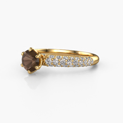 The ring shown above is called the Meryl. We call this type of ring a pavé solitaire ring because it has one centre gemstone and a band that is also pave set with gemstones. This engagement ring is made in 14 Carat gold set with a 5.7 mm round smokey quartz, and pave set diamonds at the sides. Each piece of jewellery is made just for you, with attention to detail and design.This exclusive gold pavé solitaire engagement ring has an exquisite round smokey quartz centre stone. To further accentuate the centre stone, the band is set full with more diamonds. Its open prong setting allows light to strike the smokey quartz from various angles and this adds sparkle to your smokey quartz ring. The photo shown above depicts the goldsmith's carefully handcrafted details of the ring. The high positioning of the centre stone is truly eye-catching. The perfect engagement ring for the crown jewel of your life!After receiving your order, our goldsmiths will passionately start the creative process of making your engagement ring in our own studio. Because we don't have a big stockpile, these costs will not be passed on to you. Our pricing is proof of that! We offer top quality jewels at lowest price, guaranteed.Have you found a specific engagement ring somewhere which you would like to give to your loved one? Please feel free to express your wishes to our jewel designers because we would be honoured to turn your design into a exclusive engagement ring. You can follow the development of your ring design because we use 3D drawings. This gives you a realistic preview of how your design will look. You can also preorder a dummy. A dummy is a plastic ring, which can be shaped according your ring design. You can try it on and check if its width and size are suitable for you. We will gladly send you a non-binding offer, based on a fair price/ quality ratio. It will amaze you, considering the quality of the ring and gemstones.To make it easier for you, we offer a 30 day return policy. Check our terms and conditions.