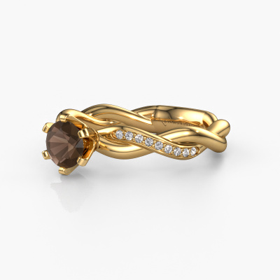 In your eyes, no one else compares to her. She is one in a million, unlike anyone else and pure? These qualities are emphasized perfectly by our fantasy gold solitaire smokey quartz ring. This smokey quartz is carefully selected by our keen artisan goldsmiths. It equals the unique qualities of the love of your life. There is no better way to memorialize your proposal than this symbol of true love. The ring shown above is called the Page, we call this a solitaire ring because it contains a single gemstone. The engagement ring is made in 14 Carat gold and has a round smokey quartz of 5.4 mm. Each piece of jewellery is made with passion and love by one of our master goldsmiths.Are you on a budget? Please feel free to contact us, so we can go discuss your options. We offer our engagement rings at guaranteed best price, because we make them to order. You won't find such a price anywhere else!Do you have a specific ring in mind? One you came across somewhere. Please feel free to tell us your wishes and we will turn your design into a unique engagement ring. You can follow the development of your ring design because we use 3D drawings. This gives you a realistic preview of your design. We will gladly send you a non-binding offer, based on a fair price/ quality ratio. It will amaze you.To make it easier for you, we offer a 30 day return policy. Check our terms and conditions.