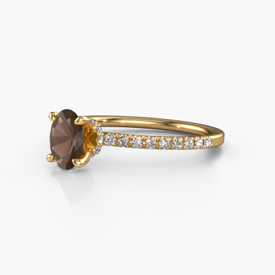 The ring shown above is called the Crystal OVL 4. We call this type of ring a pavé solitaire ring because it has one centre gemstone and a band that is also pave set with gemstones. The 14 Carat gold engagement ring is set with a oval 7x5 mm smokey quartz centre stone and the band is pave set with diamond gemstones. Each jewel is made with passion and love by one of our master goldsmiths.This contemporary gold pavé solitaire engagement ring has an exquisite oval smokey quartz centre stone. To further accentuate the centre stone, the band is fully set with more diamonds. Its open prong setting allows light to strike the smokey quartz from various angles and this adds sparkle to your smokey quartz ring. The photo shown above depicts the goldsmith's carefully handcrafted details of the ring. The high positioning of the centre stone is truly eye-catching. The perfect engagement ring for the crown jewel of your life! After receiving your order, our goldsmiths will passionately start the creative process of making your engagement ring in our own studio. Because we don't have a big stockpile, these costs will not be passed on to you. Our pricing is proof of that! We offer top quality jewels at lowest price, guaranteed.Our team adds new designs to our online collection daily. Our designers and goldsmiths work together in creating the best design. We strive to offer a diverse collection of jewels. Perhaps you have a specific jewel design in mind. One you came across somewhere. Please contact us for a free consultation. We will make you an offer, based on a fair price/ quality ratio, that will baffle you.To make it easier for you, we offer a 30 day return policy. Check our terms and conditions.