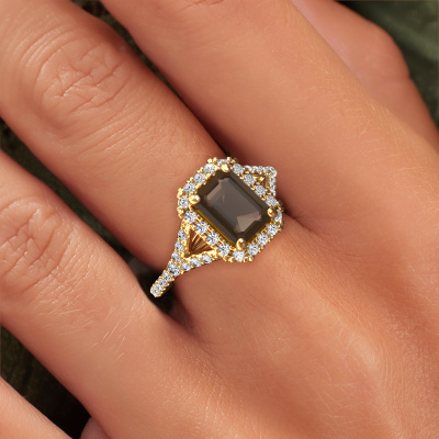 The ring shown above is called the Kimber EME. We call this type of ring a pavé solitaire ring because it has one centre gemstone and a band that is also pave set with gemstones. The 14 Carat gold engagement ring is set with a emerald cut 8x6 mm smokey quartz centre stone and the band is pave set with lab grown diamond gemstones. Each jewel is made by a team of passionate goldsmiths and jewel designers. This will make your crown jewel truly eye-catching.This exclusive gold pavé solitaire engagement ring has an exquisite emerald cut smokey quartz centre stone. To further accentuate the centre stone, the band is fully set with more lab-grown diamonds. Its open prong setting allows light to strike the smokey quartz from various angles and this adds sparkle to your smokey quartz ring. The photo shown above depicts the goldsmith's carefully handcrafted details of the ring. The high positioning of the centre stone is truly eye-catching. The perfect engagement ring for the crown jewel of your life! By using a combination of the latest modern techniques, combined with ancient crafting, we can make all our engagement rings in our own studio. Each jewel is made to order. This is advantageous because we can offer you a price you won't find anywhere else.Our team adds new designs to our online collection daily. Our designers and goldsmiths work together in creating the best design. We strive to offer a diverse collection of jewels. Perhaps you have a specific jewel design in mind. One you came across somewhere. Please contact us for a free consultation. We will make you an offer, based on a fair price/ quality ratio, that will baffle you.To make it easier for you, we offer a 30 day return policy. Check our terms and conditions.