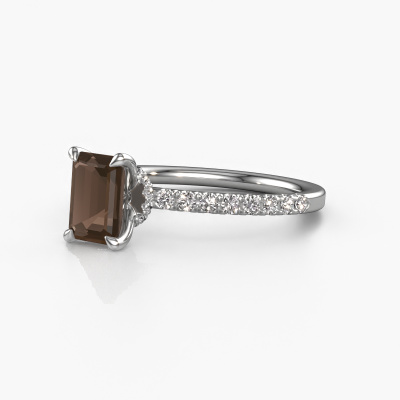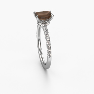 The ring shown above is called the Crystal EME 4. We call this type of ring a pavé solitaire ring because it has one centre gemstone and a band that is also pave set with gemstones. The platinum engagement ring is set with a emerald cut 7x5 mm smokey quartz centre stone and the band is pave set with lab grown diamond gemstones. Each jewel is created to add sparkle to your finger, each jewel is lovingly made by hand by our goldsmiths.This fashionable platinum pavé solitaire engagement ring has an exquisite emerald cut smokey quartz centre stone. To further accentuate the centre stone, the band is fully set with more lab-grown diamonds. Its open prong setting allows light to strike the smokey quartz from various angles and this adds sparkle to your smokey quartz ring. The photo shown above depicts the goldsmith's carefully handcrafted details of the ring. The high positioning of the centre stone is truly eye-catching. The perfect engagement ring for the crown jewel of your life! After receiving your order, our goldsmiths will passionately start the creative process of making your engagement ring in our own studio. Because we don't have a big stockpile, these costs will not be passed on to you. Our pricing is proof of that! We offer top quality jewels at lowest price, guaranteed.Our team adds new designs to our online collection daily. Our designers and goldsmiths work together in creating the best design. We strive to offer a diverse collection of jewels. Perhaps you have a specific jewel design in mind. One you came across somewhere. Please contact us for a free consultation. We will make you an offer, based on a fair price/ quality ratio, that will baffle you.To make it easier for you, we offer a 30 day return policy. Check our terms and conditions.