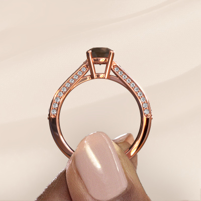 The ring shown above is called the Ruby rnd. We call this type of ring a pavé solitaire ring because it has one centre gemstone and a band that is also pave set with gemstones. This engagement ring is made in 14 Carat rose gold set with a 5.7 mm round smokey quartz, and pave set diamonds at the sides. Each piece of jewellery is made just for you, with attention to detail and design.This exclusive rose gold pavé solitaire engagement ring has an exquisite round smokey quartz centre stone. To further accentuate the centre stone, the band is set full with more diamonds. Its open prong setting allows light to strike the smokey quartz from various angles and this adds sparkle to your smokey quartz ring. The photo shown above depicts the goldsmith's carefully handcrafted details of the ring. The high positioning of the centre stone is truly eye-catching. The perfect engagement ring for the crown jewel of your life!Because we design and deliver our own rings, we can offer you a engagement ring at a price you won't find anywhere else. A ring is made to order, which helps prevent excess supplies, so we can make you a great price offer. We understand it feels risky, buying your engagement ring online, but we will gladly assist in the designing process, taking your budget into consideration.Do you have a specific ring in mind? One you came across somewhere. Please feel free to tell us your wishes and we will turn your design into a unique engagement ring. You can follow the development of your ring design because we use 3D drawings. This gives you a realistic preview of your design. We will gladly send you a non-binding offer, based on a fair price/ quality ratio. It will amaze you.To make it easier for you, we offer a 30 day return policy. Check our terms and conditions.