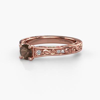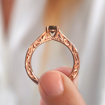 The ring shown above is called the Mallory rnd. We call this type of ring a pavé solitaire ring because it has one centre gemstone and a band that is also pave set with gemstones. This engagement ring is made in 14 Carat rose gold set with a 5 mm round smokey quartz, and pave set lab-grown diamonds at the sides. Each piece of jewellery is made just for you by our master goldsmiths in our own studio.This vintage rose gold pavé solitaire engagement ring has an exquisite round smokey quartz centre stone. To further accentuate the centre stone, the band is set full with more lab-grown diamonds. Its open prong setting allows light to strike the smokey quartz from various angles and this adds sparkle to your smokey quartz ring. The photo shown above depicts the goldsmith's carefully handcrafted details of the ring. The high positioning of the centre stone is truly eye-catching. The perfect engagement ring for the crown jewel of your life!Because we design and deliver our own rings, we can offer you a engagement ring at a price you won't find anywhere else. A ring is made to order, which helps prevent excess supplies, so we can make you a great price offer. We understand it feels risky, buying your engagement ring online, but we will gladly assist in the designing process, taking your budget into consideration.Different styles of new rings are made daily by our team. Perhaps you have found a pavé solitaire engagement ring somewhere. One you would like to give to your loved one. Please feel free to share your thoughts and design with our jewel designers. We would love to turn your design into a vintage engagement ring. You can follow the development of your ring design because we use very detailed 3D drawings. On top of that, you can order a dummy of the design. A dummy is a plastic ring, which can be shaped according your ring design. You can try it on and check if the engagement ring is up to standard. We will gladly send you a non-binding offer, based on a fair price/ quality ratio. The offer will baffle you, considering the quality of the ring and gemstones.To make it easier for you, we offer a 30 day return policy. Check our terms and conditions.