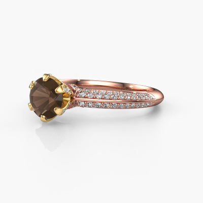 The ring shown above is called the Abby. We call this type of ring a pavé solitaire ring because it has one centre gemstone and a band that is also pave set with gemstones. The 14 Carat rose gold engagement ring is set with a round 6.5 mm smokey quartz centre stone and the band is pave set with diamond gemstones. Each jewel is made just for you by our master goldsmiths in our own studio.This exclusive rose gold pavé solitaire engagement ring has an exquisite round smokey quartz centre stone. To further accentuate the centre stone, the band is fully set with more diamonds. Its open prong setting allows light to strike the smokey quartz from various angles and this adds sparkle to your smokey quartz ring. The photo shown above depicts the goldsmith's carefully handcrafted details of the ring. The high positioning of the centre stone is truly eye-catching. The perfect engagement ring for the crown jewel of your life! Are you on a budget? Please feel free to contact us, so we can go discuss your options. We offer our engagement rings at guaranteed best price, because we make them to order. You won't find such a price anywhere else!Our team adds new designs to our online collection daily. Our designers and goldsmiths work together in creating the best design. We strive to offer a diverse collection of jewels. Perhaps you have a specific jewel design in mind. One you came across somewhere. Please contact us for a free consultation. We will make you an offer, based on a fair price/ quality ratio, that will baffle you.To make it easier for you, we offer a 30 day return policy. Check our terms and conditions.