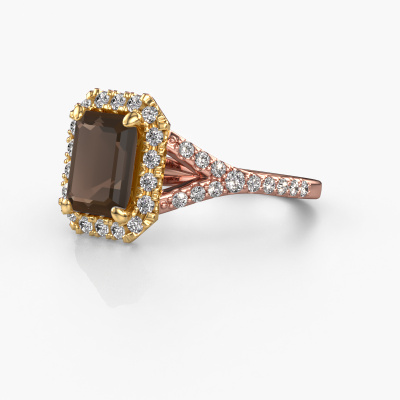 The ring shown above is called the Kimber EME. We call this type of ring a pavé solitaire ring because it has one centre gemstone and a band that is also pave set with gemstones. The 14 Carat rose gold engagement ring is set with a emerald cut 8x6 mm smokey quartz centre stone and the band is pave set with lab grown diamond gemstones. Each jewel is made by a team of passionate goldsmiths and jewel designers. This will make your crown jewel truly eye-catching.This exclusive rose gold pavé solitaire engagement ring has an exquisite emerald cut smokey quartz centre stone. To further accentuate the centre stone, the band is fully set with more lab-grown diamonds. Its open prong setting allows light to strike the smokey quartz from various angles and this adds sparkle to your smokey quartz ring. The photo shown above depicts the goldsmith's carefully handcrafted details of the ring. The high positioning of the centre stone is truly eye-catching. The perfect engagement ring for the crown jewel of your life! By using a combination of the latest modern techniques, combined with ancient crafting, we can make all our engagement rings in our own studio. Each jewel is made to order. This is advantageous because we can offer you a price you won't find anywhere else.Our team adds new designs to our online collection daily. Our designers and goldsmiths work together in creating the best design. We strive to offer a diverse collection of jewels. Perhaps you have a specific jewel design in mind. One you came across somewhere. Please contact us for a free consultation. We will make you an offer, based on a fair price/ quality ratio, that will baffle you.To make it easier for you, we offer a 30 day return policy. Check our terms and conditions.