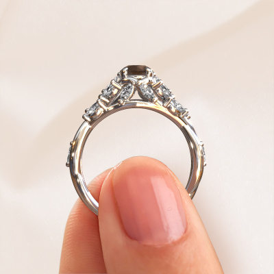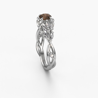 The ring shown above is called the Samantha RND. We call this type of ring a pavé solitaire ring because it has one centre gemstone and a band that is also pave set with gemstones. This engagement ring is made in 14 Carat white gold set with a 5 mm round smokey quartz, and pave set diamonds at the sides. Each piece of jewellery is made with passion and love by one of our master goldsmiths.This contemporary white gold pavé solitaire engagement ring has an exquisite round smokey quartz centre stone. To further accentuate the centre stone, the band is set full with more diamonds. Its open prong setting allows light to strike the smokey quartz from various angles and this adds sparkle to your smokey quartz ring. The photo shown above depicts the goldsmith's carefully handcrafted details of the ring. The high positioning of the centre stone is truly eye-catching. The perfect engagement ring for the crown jewel of your life!By using a combination of the latest modern techniques, combined with ancient crafting, we can make all our engagement rings in our own studio. Each jewel is made to order. This is advantageous because we can offer you a price you won't find anywhere else.Our designers and goldsmiths work together each day, creating new jewels. Perhaps you have found a nice contemporary engagement ring somewhere, which can be used to customize your unique ring. Please feel free to contact us. We will make you an offer, based on a fair price/ quality ratio, which will amaze you.To make it easier for you, we offer a 30 day return policy. Check our terms and conditions.