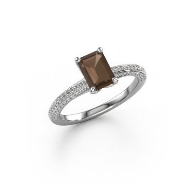 The ring shown above is called the Elenore eme. We call this type of ring a pavé solitaire ring because it has one centre gemstone and a band that is also pave set with gemstones. This engagement ring is made in 14 Carat white gold set with a 7x5 mm emerald cut smokey quartz, and pave set lab-grown diamonds at the sides. Each piece of jewellery is made just for you, with attention to detail and design.This exclusive white gold pavé solitaire engagement ring has an exquisite emerald cut smokey quartz centre stone. To further accentuate the centre stone, the band is set full with more lab-grown diamonds. Its open prong setting allows light to strike the smokey quartz from various angles and this adds sparkle to your smokey quartz ring. The photo shown above depicts the goldsmith's carefully handcrafted details of the ring. The high positioning of the centre stone is truly eye-catching. The perfect engagement ring for the crown jewel of your life!Are you on a budget? Please feel free to contact us, so we can go discuss your options. We offer our engagement rings at guaranteed best price, because we make them to order. You won't find such a price anywhere else!Have you found a specific engagement ring somewhere which you would like to give to your loved one? Please feel free to express your wishes to our jewel designers because we would be honoured to turn your design into a exclusive engagement ring. You can follow the development of your ring design because we use 3D drawings. This gives you a realistic preview of how your design will look. You can also preorder a dummy. A dummy is a plastic ring, which can be shaped according your ring design. You can try it on and check if its width and size are suitable for you. We will gladly send you a non-binding offer, based on a fair price/ quality ratio. It will amaze you, considering the quality of the ring and gemstones.To make it easier for you, we offer a 30 day return policy. Check our terms and conditions.