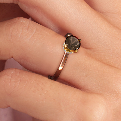 The ring shown above is called the Crystal RND 3, we call this a solitaire ring because it contains a single gemstone. The engagement ring is made in 14 Carat rose gold and has a round smokey quartz of 5.5 mm. The cool thing about our configurator is that you can compile your own piece of jewellery, into a completely personalized one. This solitaire ring is crafted in the precious metals rose gold with gold, but of course you are free to pick your own colours. Each piece of jewellery is made with passion and love by one of our master goldsmiths.The solitaire ring is a special type of engagement ring. Its open prong setting allows light to strike the gemstone from various angles. This classic engagement ring is a stunning eye-catcher because of the high positioning of the gemstone. In order for you to commemorate your proposal with a unique ring, we carefully adorn this solitaire ring by hand. The love of your life deserves nothing but the best. By using a combination of the latest modern techniques, combined with ancient crafting, we can make all our engagement rings in our own studio. Each jewel is made to order. This is advantageous because we can offer you a price you won't find anywhere else.Different styles of new rings are made daily by our team. Perhaps you have found a solitaire engagement ring somewhere. One you would like to give to your loved one. Please feel free to share your thoughts and design with our jewel designers. We would love to turn your design into a classic engagement ring. You can follow the development of your ring design because we use very detailed 3D drawings. On top of that, you can order a dummy of the design. A dummy is a plastic ring, which can be shaped according your ring design. You can try it on and check if the engagement ring is up to standard. We will gladly send you a non-binding offer, based on a fair price/ quality ratio. The offer will baffle you, considering the quality of the ring and gemstones.To make it easier for you, we offer a 30 day return policy. Check our terms and conditions.