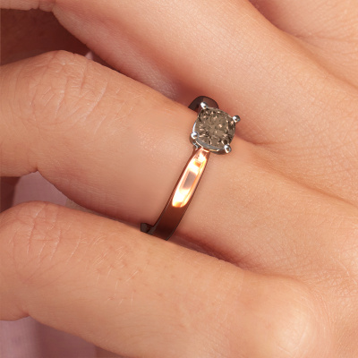 This 14 Carat rose gold ring is called Mignon cus 1 and is set with 0.70 crt brown diamond. This exclusive rose gold solitaire engagement ring is a true work of art! The ornaments are crafted with a lot of patience and great passion. In order to create this ring with great precision, this craft requires a keen eye and skilful hand. A challenge which ignites a fire in our expert goldsmith. The exquisite brown diamonds are set in a special way so they stand out even more. This gives the ring an even more glamorous appearance. The edgy engagement ring is actually unique on its own because of the gemstones which we carefully select especially for this ring. On top of that you select the precious metals which will be used to create a unique ring for the most extraordinary woman in your life! This jewel is made by a team of passionate goldsmiths and jewel designers. This will make your crown jewel truly eye-catching.Are you on a budget? Please feel free to contact us, so we can go discuss your options. We offer our engagement rings at guaranteed best price, because we make them to order. You won't find such a price anywhere else!Different styles of new rings are made daily by our team. Perhaps you have found a solitaire engagement ring somewhere. One you would like to give to your loved one. Please feel free to share your thoughts and design with our jewel designers. We would love to turn your design into a luxury engagement ring. You can follow the development of your ring design because we use very detailed 3D drawings. On top of that, you can order a dummy of the design. A dummy is a plastic ring, which can be shaped according your ring design. You can try it on and check if the engagement ring is up to standard. We will gladly send you a non-binding offer, based on a fair price/ quality ratio. The offer will baffle you, considering the quality of the ring and gemstones.To make it easier for you, we offer a 30 day return policy. Check our terms and conditions.