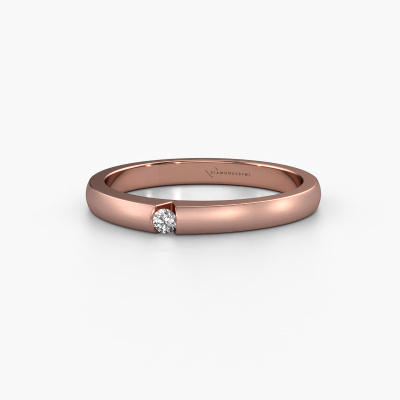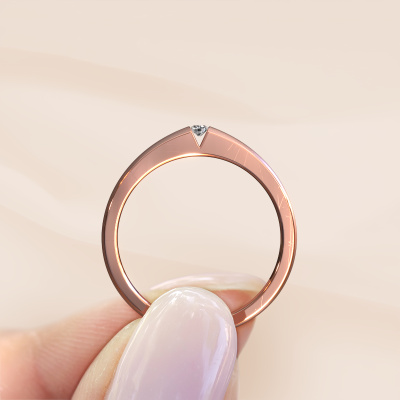 This 14 Carat rose gold ring is called Theresia and is set with 0.03 crt diamond. The tension setting is what makes this a special engagement ring because it emphasizes the diamond. Our expert goldsmith uses special techniques to set the diamond in this rose gold ring. By using these techniques, light reflects freely. This gives the ring its maximum shine and a glamorous appearance. A true work of art! The result is a unique ring, with a trendy appearance, passionately handcrafted to perfection by our expert goldsmith. A one-of-a-kind ring, designed for the love of your life. We recommend a solid gemstone, such as a diamond or sapphire, if you select this ring. The ring must be able to endure a lot of pressure during manufacturing. This piece of jewelry is made just for you by our master goldsmiths in our own studio.By using our modern techniques, we can design and customize the finest quality jewels with the utmost care for you. Our engagement rings are always priced 30 percent lower than other jewellers. We make engagement rings to order so we don't have to maintain a large stock. If you have a certain budget, we are more than happy to advice you accordingly.Different styles of new rings are made daily by our team. Perhaps you have found a solitaire engagement ring somewhere. One you would like to give to your loved one. Please feel free to share your thoughts and design with our jewel designers. We would love to turn your design into a modern engagement ring. You can follow the development of your ring design because we use very detailed 3D drawings. On top of that, you can order a dummy of the design. A dummy is a plastic ring, which can be shaped according your ring design. You can try it on and check if the engagement ring is up to standard. We will gladly send you a non-binding offer, based on a fair price/ quality ratio. The offer will baffle you, considering the quality of the ring and gemstones.To make it easier for you, we offer a 30 day return policy. Check our terms and conditions.