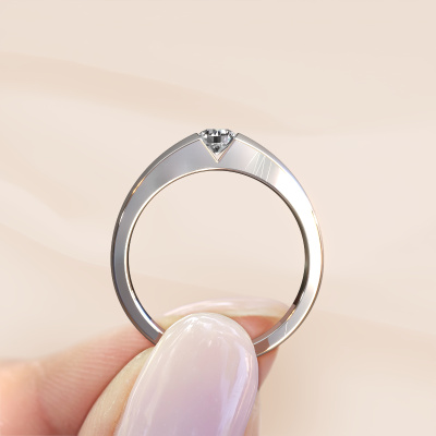This 14 Carat white gold ring is called Theresia and is set with 0.30 crt diamond. The tension setting is what makes this a special engagement ring because it emphasizes the diamond. Our expert goldsmith uses special techniques to set the diamond in this white gold ring. By using these techniques, light reflects freely. This gives the ring its maximum shine and a glamorous appearance. A true work of art! The result is a unique ring, with a trendy appearance, passionately handcrafted to perfection by our expert goldsmith. A one-of-a-kind ring, designed for the love of your life. We recommend a solid gemstone, such as a diamond or sapphire, if you select this ring. The ring must be able to endure a lot of pressure during manufacturing. This piece of jewelry is made just for you by our master goldsmiths in our own studio.By using our modern techniques, we can design and customize the finest quality jewels with the utmost care for you. Our engagement rings are always priced 30 percent lower than other jewellers. We make engagement rings to order so we don't have to maintain a large stock. If you have a certain budget, we are more than happy to advice you accordingly.Different styles of new rings are made daily by our team. Perhaps you have found a solitaire engagement ring somewhere. One you would like to give to your loved one. Please feel free to share your thoughts and design with our jewel designers. We would love to turn your design into a modern engagement ring. You can follow the development of your ring design because we use very detailed 3D drawings. On top of that, you can order a dummy of the design. A dummy is a plastic ring, which can be shaped according your ring design. You can try it on and check if the engagement ring is up to standard. We will gladly send you a non-binding offer, based on a fair price/ quality ratio. The offer will baffle you, considering the quality of the ring and gemstones.To make it easier for you, we offer a 30 day return policy. Check our terms and conditions.