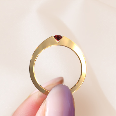 This 14 Carat gold ring is called Lizzy 1 and is set with garnet. Do you keep up with the latest fashion trends? Do you want a unique engagement ring that matches your lifestyle? This edgy engagement ring is an extraordinary ring which can be custom-made to fit your or her personal style. This modern gold engagement ring is set with garnet. Our garnet are carefully selected for this specific ring in order to create the best effect. Our expert goldsmith will create your ring in our own artisan studio where the garnet will be set with great care. The ring will then be polished to perfection. Nothing but the best for the love of your life! This jewel is created to add sparkle to your finger, each jewel is lovingly made by hand by our goldsmiths.By using our modern techniques, we can design and customize the finest quality jewels with the utmost care for you. Our engagement rings are always priced 30 percent lower than other jewellers. We make engagement rings to order so we don't have to maintain a large stock. If you have a certain budget, we are more than happy to advice you accordingly.Do you have a specific ring in mind? One you came across somewhere. Please feel free to tell us your wishes and we will turn your design into a unique engagement ring. You can follow the development of your ring design because we use 3D drawings. This gives you a realistic preview of your design. We will gladly send you a non-binding offer, based on a fair price/ quality ratio. It will amaze you.To make it easier for you, we offer a 30 day return policy. Check our terms and conditions.