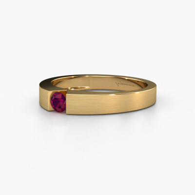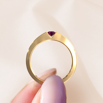 This 14 Carat gold ring is called Lizzy 1 and is set with rhodolite. Do you keep up with the latest fashion trends? Do you want a unique engagement ring that matches your lifestyle? This edgy engagement ring is an extraordinary ring which can be custom-made to fit your or her personal style. This modern gold engagement ring is set with rhodolite. Our rhodolite are carefully selected for this specific ring in order to create the best effect. Our expert goldsmith will create your ring in our own artisan studio where the rhodolite will be set with great care. The ring will then be polished to perfection. Nothing but the best for the love of your life! This jewel is created to add sparkle to your finger, each jewel is lovingly made by hand by our goldsmiths.By using our modern techniques, we can design and customize the finest quality jewels with the utmost care for you. Our engagement rings are always priced 30 percent lower than other jewellers. We make engagement rings to order so we don't have to maintain a large stock. If you have a certain budget, we are more than happy to advice you accordingly.Do you have a specific ring in mind? One you came across somewhere. Please feel free to tell us your wishes and we will turn your design into a unique engagement ring. You can follow the development of your ring design because we use 3D drawings. This gives you a realistic preview of your design. We will gladly send you a non-binding offer, based on a fair price/ quality ratio. It will amaze you.To make it easier for you, we offer a 30 day return policy. Check our terms and conditions.