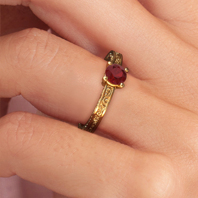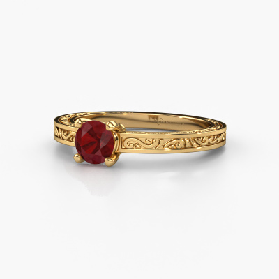 This 14 Carat gold ring is called Claudette 1 and is set with 5 mm ruby. Is your girlfriend hooked on vintage? Then this gold graceful engagement ring will surely match her style perfectly. A trendy ring with just a hint of Celtic adornment. A truly stunning, romantic design! Especially when you customize your ring to your own liking. This Celtic solitaire engagement ring is set with stunning ruby. As you can see, you are the boss in selecting a gemstone which matches the style of your girlfriend best. Each gemstone is carefully selected by our merchants whom are spread throughout the world. Nothing but the best gems for our expert goldsmith. After all, it is his crowning glory! Each jewel is unique in every way! Simply customize to your liking,After receiving your order, our goldsmiths will start the creative process of making your Claudette 1 engagement ring. We don't keep stock. This is advantageous because these costs will not be passed on to you. Therefore, we can offer jewellery at exceptionally low prices.Our team adds new designs to our online collection daily. Our designers and goldsmiths work together in creating the best design. We strive to offer a diverse collection of jewels. Perhaps you have a specific jewel design in mind. One you came across somewhere. Please contact us for a free consultation. We will make you an offer, based on a fair price/ quality ratio, that will baffle you.To make it easier for you, we offer a 30 day return policy. Check our terms and conditions.