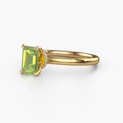 The ring shown above is called the Crystal EME 3, we call this a solitaire ring because it contains a single gemstone. The engagement ring is made in 14 Carat gold and has a emerald cut peridot of 7x5 mm. This classic gold solitaire ring with exquisite emerald cut peridot is a beautiful engagement ring. The open prong setting allows light to strike the gemstone from various angles. The ring also stands out because of the high positioning of the gemstone. Because diamonds symbolize true love and purity, they make the perfect gift for the love of your life. The symbol of eternal love is the centerpiece of this solitaire ring. Like a diamond, all other types of precious metal have their own attributed symbolic meaning. You can compile the solitaire engagement ring yourself in various precious metal combinations. This one has the combination of 14 Carat gold with gold. Each piece of jewelry is made by a team of passionate goldsmiths and jewel designers. This will make your crown jewel truly eye-catching.By using our modern techniques, we can design and customize the finest quality jewels with the utmost care for you. Our engagement rings are always priced 30 percent lower than other jewellers. We make engagement rings to order so we don't have to maintain a large stock. If you have a certain budget, we are more than happy to advice you accordingly.Do you have a specific ring in mind? One you came across somewhere. Please feel free to tell us your wishes and we will turn your design into a unique engagement ring. You can follow the development of your ring design because we use 3D drawings. This gives you a realistic preview of your design. We will gladly send you a non-binding offer, based on a fair price/ quality ratio. It will amaze you.To make it easier for you, we offer a 30 day return policy. Check our terms and conditions.