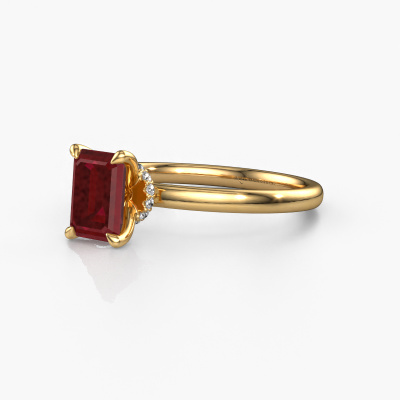 The ring shown above is called the Crystal EME 3, we call this a solitaire ring because it contains a single gemstone. The engagement ring is made in 14 Carat gold and has a emerald cut ruby of 7x5 mm. This classic gold solitaire ring with exquisite emerald cut ruby is a beautiful engagement ring. The open prong setting allows light to strike the gemstone from various angles. The ring also stands out because of the high positioning of the gemstone. Because diamonds symbolize true love and purity, they make the perfect gift for the love of your life. The symbol of eternal love is the centerpiece of this solitaire ring. Like a diamond, all other types of precious metal have their own attributed symbolic meaning. You can compile the solitaire engagement ring yourself in various precious metal combinations. This one has the combination of 14 Carat gold with gold. Each piece of jewelry is made by a team of passionate goldsmiths and jewel designers. This will make your crown jewel truly eye-catching.By using our modern techniques, we can design and customize the finest quality jewels with the utmost care for you. Our engagement rings are always priced 30 percent lower than other jewellers. We make engagement rings to order so we don't have to maintain a large stock. If you have a certain budget, we are more than happy to advice you accordingly.Do you have a specific ring in mind? One you came across somewhere. Please feel free to tell us your wishes and we will turn your design into a unique engagement ring. You can follow the development of your ring design because we use 3D drawings. This gives you a realistic preview of your design. We will gladly send you a non-binding offer, based on a fair price/ quality ratio. It will amaze you.To make it easier for you, we offer a 30 day return policy. Check our terms and conditions.