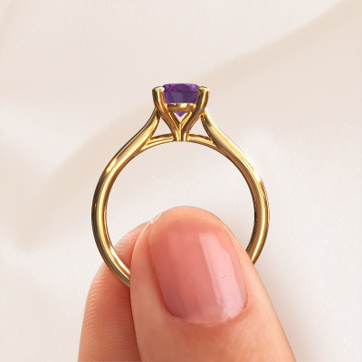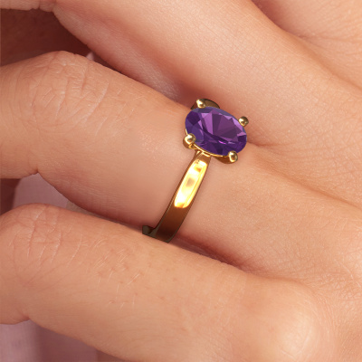 The ring shown above is called the Mignon ovl 1, we call this a solitaire ring because it contains a single gemstone. The engagement ring is made in 14 Carat gold and has a oval amethyst of 8x6 mm. This traditional gold solitaire ring with exquisite oval amethyst is a beautiful engagement ring. The open prong setting allows light to strike the gemstone from various angles. The ring also stands out because of the high positioning of the gemstone. Because diamonds symbolize true love and purity, they make the perfect gift for the love of your life. The symbol of eternal love is the centerpiece of this solitaire ring. Like a diamond, all other types of precious metal have their own attributed symbolic meaning. You can compile the solitaire engagement ring yourself in various precious metal combinations. This one has the combination of 14 Carat gold with gold. Each piece of jewelry is made by a team of passionate goldsmiths and jewel designers. This will make your crown jewel truly eye-catching.By using a combination of the latest modern techniques, combined with ancient crafting, we can make all our engagement rings in our own studio. Each jewel is made to order. This is advantageous because we can offer you a price you won't find anywhere else.Our designers and goldsmiths work together each day, creating new jewels. Perhaps you have found a nice traditional engagement ring somewhere, which can be used to customize your unique ring. Please feel free to contact us. We will make you an offer, based on a fair price/ quality ratio, which will amaze you.To make it easier for you, we offer a 30 day return policy. Check our terms and conditions.