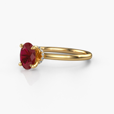 The ring shown above is called the Crystal OVL 3, we call this a solitaire ring because it contains a single gemstone. The engagement ring is made in 14 Carat gold and has a oval ruby of 7,5x5,5 mm. This unique gold solitaire ring with exquisite oval ruby is a beautiful engagement ring. The open prong setting allows light to strike the gemstone from various angles. The ring also stands out because of the high positioning of the gemstone. Because diamonds symbolize true love and purity, they make the perfect gift for the love of your life. The symbol of eternal love is the centerpiece of this solitaire ring. Like a diamond, all other types of precious metal have their own attributed symbolic meaning. You can compile the solitaire engagement ring yourself in various precious metal combinations. This one has the combination of 14 Carat gold with gold. Each piece of jewelry is made just for you by our master goldsmiths in our own studio.After receiving your order, our goldsmiths will passionately start the creative process of making your engagement ring in our own studio. Because we don't have a big stockpile, these costs will not be passed on to you. Our pricing is proof of that! We offer top quality jewels at lowest price, guaranteed.Our designers and goldsmiths work together each day, creating new jewels. Perhaps you have found a nice unique engagement ring somewhere, which can be used to customize your unique ring. Please feel free to contact us. We will make you an offer, based on a fair price/ quality ratio, which will amaze you.To make it easier for you, we offer a 30 day return policy. Check our terms and conditions.