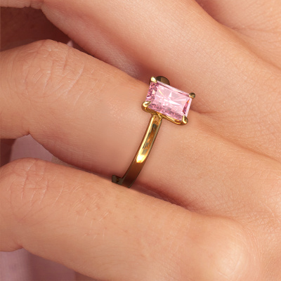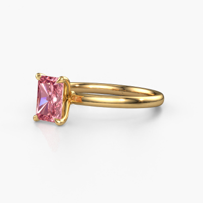 The ring shown above is called the Crystal RAD 1, we call this a solitaire ring because it contains a single gemstone. The engagement ring is made in 14 Carat gold and has a radiant pink lab grown diamond of 7x5 mm. This modern gold solitaire ring with exquisite radiant pink lab grown diamond is a beautiful engagement ring. The open prong setting allows light to strike the gemstone from various angles. The ring also stands out because of the high positioning of the gemstone. Because diamonds symbolize true love and purity, they make the perfect gift for the love of your life. The symbol of eternal love is the centerpiece of this solitaire ring. Like a diamond, all other types of precious metal have their own attributed symbolic meaning. You can compile the solitaire engagement ring yourself in various precious metal combinations. This one has the combination of 14 Carat gold with gold. Each piece of jewelry is made by a team of passionate goldsmiths and jewel designers. This will make your crown jewel truly eye-catching.After receiving your order, our goldsmiths will passionately start the creative process of making your engagement ring in our own studio. Because we don't have a big stockpile, these costs will not be passed on to you. Our pricing is proof of that! We offer top quality jewels at lowest price, guaranteed.Have you found a specific engagement ring somewhere which you would like to give to your loved one? Please feel free to express your wishes to our jewel designers because we would be honoured to turn your design into a modern engagement ring. You can follow the development of your ring design because we use 3D drawings. This gives you a realistic preview of how your design will look. You can also preorder a dummy. A dummy is a plastic ring, which can be shaped according your ring design. You can try it on and check if its width and size are suitable for you. We will gladly send you a non-binding offer, based on a fair price/ quality ratio. It will amaze you, considering the quality of the ring and gemstones.To make it easier for you, we offer a 30 day return policy. Check our terms and conditions.