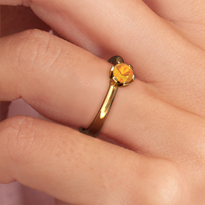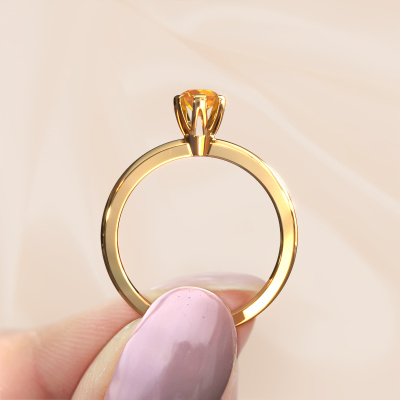 The ring shown above is called the Julia, we call this a solitaire ring because it contains a single gemstone. The engagement ring is made in 14 Carat gold and has a round citrin of 4 mm. This trendy gold solitaire ring with exquisite round citrin is a beautiful engagement ring. The open prong setting allows light to strike the gemstone from various angles. The ring also stands out because of the high positioning of the gemstone. Because diamonds symbolize true love and purity, they make the perfect gift for the love of your life. The symbol of eternal love is the centerpiece of this solitaire ring. Like a diamond, all other types of precious metal have their own attributed symbolic meaning. You can compile the solitaire engagement ring yourself in various precious metal combinations. This one has the combination of 14 Carat gold with gold. Each piece of jewelry is created to add sparkle to your finger, each jewel is lovingly made by hand by our goldsmiths.Are you on a budget? Please feel free to contact us, so we can go discuss your options. We offer our engagement rings at guaranteed best price, because we make them to order. You won't find such a price anywhere else!Different styles of new rings are made daily by our team. Perhaps you have found a solitaire engagement ring somewhere. One you would like to give to your loved one. Please feel free to share your thoughts and design with our jewel designers. We would love to turn your design into a trendy engagement ring. You can follow the development of your ring design because we use very detailed 3D drawings. On top of that, you can order a dummy of the design. A dummy is a plastic ring, which can be shaped according your ring design. You can try it on and check if the engagement ring is up to standard. We will gladly send you a non-binding offer, based on a fair price/ quality ratio. The offer will baffle you, considering the quality of the ring and gemstones.To make it easier for you, we offer a 30 day return policy. Check our terms and conditions.