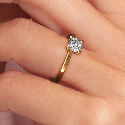 The ring shown above is called the Crystal RND 1, we call this a solitaire ring because it contains a single gemstone. The engagement ring is made in 14 Carat gold and has a round diamond of 0.60 crt. This classic gold solitaire ring with exquisite round diamond is a beautiful engagement ring. The open prong setting allows light to strike the gemstone from various angles. The ring also stands out because of the high positioning of the gemstone. Because diamonds symbolize true love and purity, they make the perfect gift for the love of your life. The symbol of eternal love is the centerpiece of this solitaire ring. Like a diamond, all other types of precious metal have their own attributed symbolic meaning. You can compile the solitaire engagement ring yourself in various precious metal combinations. This one has the combination of 14 Carat gold with gold. Each piece of jewelry is made by a team of passionate goldsmiths and jewel designers. This will make your crown jewel truly eye-catching.After receiving your order, our goldsmiths will passionately start the creative process of making your engagement ring in our own studio. Because we don't have a big stockpile, these costs will not be passed on to you. Our pricing is proof of that! We offer top quality jewels at lowest price, guaranteed.Do you have a specific ring in mind? One you came across somewhere. Please feel free to tell us your wishes and we will turn your design into a unique engagement ring. You can follow the development of your ring design because we use 3D drawings. This gives you a realistic preview of your design. We will gladly send you a non-binding offer, based on a fair price/ quality ratio. It will amaze you.To make it easier for you, we offer a 30 day return policy. Check our terms and conditions.