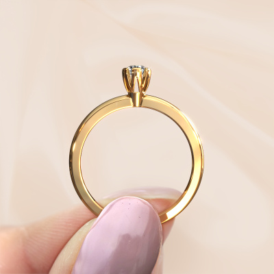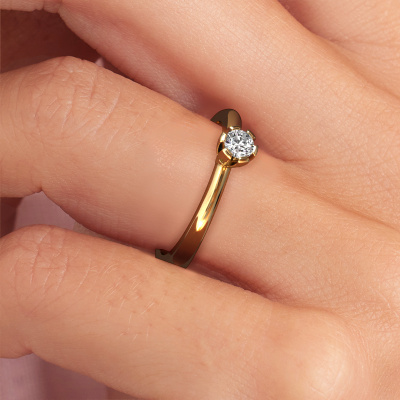 The ring shown above is called the Julia, we call this a solitaire ring because it contains a single gemstone. The engagement ring is made in 14 Carat gold and has a round diamond of 0.10 crt. This trendy gold solitaire ring with exquisite round diamond is a beautiful engagement ring. The open prong setting allows light to strike the gemstone from various angles. The ring also stands out because of the high positioning of the gemstone. Because diamonds symbolize true love and purity, they make the perfect gift for the love of your life. The symbol of eternal love is the centerpiece of this solitaire ring. Like a diamond, all other types of precious metal have their own attributed symbolic meaning. You can compile the solitaire engagement ring yourself in various precious metal combinations. This one has the combination of 14 Carat gold with gold. Each piece of jewelry is created to add sparkle to your finger, each jewel is lovingly made by hand by our goldsmiths.Are you on a budget? Please feel free to contact us, so we can go discuss your options. We offer our engagement rings at guaranteed best price, because we make them to order. You won't find such a price anywhere else!Different styles of new rings are made daily by our team. Perhaps you have found a solitaire engagement ring somewhere. One you would like to give to your loved one. Please feel free to share your thoughts and design with our jewel designers. We would love to turn your design into a trendy engagement ring. You can follow the development of your ring design because we use very detailed 3D drawings. On top of that, you can order a dummy of the design. A dummy is a plastic ring, which can be shaped according your ring design. You can try it on and check if the engagement ring is up to standard. We will gladly send you a non-binding offer, based on a fair price/ quality ratio. The offer will baffle you, considering the quality of the ring and gemstones.To make it easier for you, we offer a 30 day return policy. Check our terms and conditions.