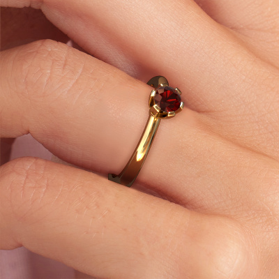The ring shown above is called the Julia, we call this a solitaire ring because it contains a single gemstone. The engagement ring is made in 14 Carat gold and has a round garnet of 4 mm. This trendy gold solitaire ring with exquisite round garnet is a beautiful engagement ring. The open prong setting allows light to strike the gemstone from various angles. The ring also stands out because of the high positioning of the gemstone. Because diamonds symbolize true love and purity, they make the perfect gift for the love of your life. The symbol of eternal love is the centerpiece of this solitaire ring. Like a diamond, all other types of precious metal have their own attributed symbolic meaning. You can compile the solitaire engagement ring yourself in various precious metal combinations. This one has the combination of 14 Carat gold with gold. Each piece of jewelry is created to add sparkle to your finger, each jewel is lovingly made by hand by our goldsmiths.Are you on a budget? Please feel free to contact us, so we can go discuss your options. We offer our engagement rings at guaranteed best price, because we make them to order. You won't find such a price anywhere else!Different styles of new rings are made daily by our team. Perhaps you have found a solitaire engagement ring somewhere. One you would like to give to your loved one. Please feel free to share your thoughts and design with our jewel designers. We would love to turn your design into a trendy engagement ring. You can follow the development of your ring design because we use very detailed 3D drawings. On top of that, you can order a dummy of the design. A dummy is a plastic ring, which can be shaped according your ring design. You can try it on and check if the engagement ring is up to standard. We will gladly send you a non-binding offer, based on a fair price/ quality ratio. The offer will baffle you, considering the quality of the ring and gemstones.To make it easier for you, we offer a 30 day return policy. Check our terms and conditions.