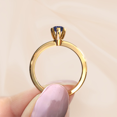 The ring shown above is called the Julia, we call this a solitaire ring because it contains a single gemstone. The engagement ring is made in 14 Carat gold and has a round sapphire of 4 mm. This trendy gold solitaire ring with exquisite round sapphire is a beautiful engagement ring. The open prong setting allows light to strike the gemstone from various angles. The ring also stands out because of the high positioning of the gemstone. Because diamonds symbolize true love and purity, they make the perfect gift for the love of your life. The symbol of eternal love is the centerpiece of this solitaire ring. Like a diamond, all other types of precious metal have their own attributed symbolic meaning. You can compile the solitaire engagement ring yourself in various precious metal combinations. This one has the combination of 14 Carat gold with gold. Each piece of jewelry is created to add sparkle to your finger, each jewel is lovingly made by hand by our goldsmiths.Are you on a budget? Please feel free to contact us, so we can go discuss your options. We offer our engagement rings at guaranteed best price, because we make them to order. You won't find such a price anywhere else!Different styles of new rings are made daily by our team. Perhaps you have found a solitaire engagement ring somewhere. One you would like to give to your loved one. Please feel free to share your thoughts and design with our jewel designers. We would love to turn your design into a trendy engagement ring. You can follow the development of your ring design because we use very detailed 3D drawings. On top of that, you can order a dummy of the design. A dummy is a plastic ring, which can be shaped according your ring design. You can try it on and check if the engagement ring is up to standard. We will gladly send you a non-binding offer, based on a fair price/ quality ratio. The offer will baffle you, considering the quality of the ring and gemstones.To make it easier for you, we offer a 30 day return policy. Check our terms and conditions.