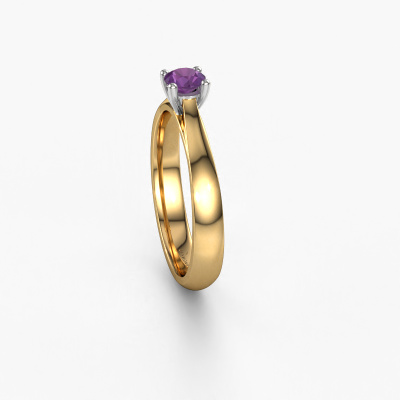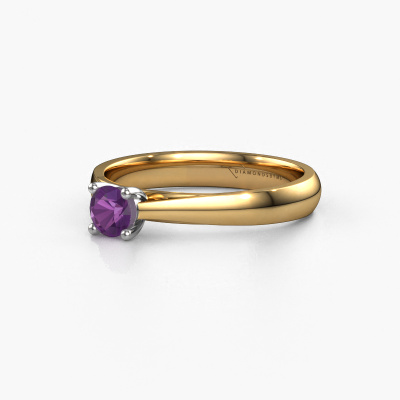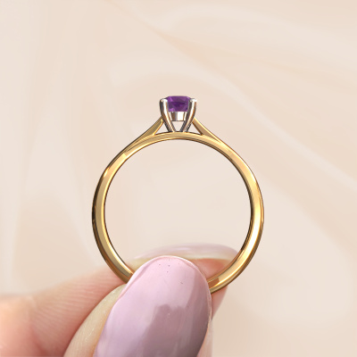 The ring shown above is called the Sam, we call this a solitaire ring because it contains a single gemstone. The engagement ring is made in 14 Carat gold and has a round amethyst of 4.2 mm. This classic gold solitaire ring with exquisite round amethyst is a beautiful engagement ring. The open prong setting allows light to strike the gemstone from various angles. The ring also stands out because of the high positioning of the gemstone. Because diamonds symbolize true love and purity, they make the perfect gift for the love of your life. The symbol of eternal love is the centerpiece of this solitaire ring. Like a diamond, all other types of precious metal have their own attributed symbolic meaning. You can compile the solitaire engagement ring yourself in various precious metal combinations. This one has the combination of 14 Carat gold with white gold. Each piece of jewelry is made just for you, with attention to detail and design.After receiving your order, our goldsmiths will passionately start the creative process of making your engagement ring in our own studio. Because we don't have a big stockpile, these costs will not be passed on to you. Our pricing is proof of that! We offer top quality jewels at lowest price, guaranteed.Our team adds new designs to our online collection daily. Our designers and goldsmiths work together in creating the best design. We strive to offer a diverse collection of jewels. Perhaps you have a specific jewel design in mind. One you came across somewhere. Please contact us for a free consultation. We will make you an offer, based on a fair price/ quality ratio, that will baffle you.To make it easier for you, we offer a 30 day return policy. Check our terms and conditions.