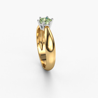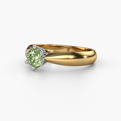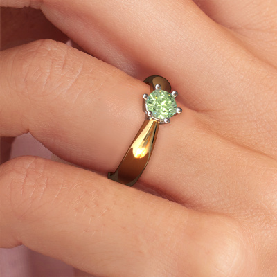 The ring shown above is called the Fay, we call this a solitaire ring because it contains a single gemstone. The engagement ring is made in 14 Carat gold and has a round green lab grown diamond of 5 mm. This traditional gold solitaire ring with exquisite round green lab grown diamond is a beautiful engagement ring. The open prong setting allows light to strike the gemstone from various angles. The ring also stands out because of the high positioning of the gemstone. Because diamonds symbolize true love and purity, they make the perfect gift for the love of your life. The symbol of eternal love is the centerpiece of this solitaire ring. Like a diamond, all other types of precious metal have their own attributed symbolic meaning. You can compile the solitaire engagement ring yourself in various precious metal combinations. This one has the combination of 14 Carat gold with white gold. Each piece of jewelry is made just for you by our master goldsmiths in our own studio.By using a combination of the latest modern techniques, combined with ancient crafting, we can make all our engagement rings in our own studio. Each jewel is made to order. This is advantageous because we can offer you a price you won't find anywhere else.Have you found a specific engagement ring somewhere which you would like to give to your loved one? Please feel free to express your wishes to our jewel designers because we would be honoured to turn your design into a traditional engagement ring. You can follow the development of your ring design because we use 3D drawings. This gives you a realistic preview of how your design will look. You can also preorder a dummy. A dummy is a plastic ring, which can be shaped according your ring design. You can try it on and check if its width and size are suitable for you. We will gladly send you a non-binding offer, based on a fair price/ quality ratio. It will amaze you, considering the quality of the ring and gemstones.To make it easier for you, we offer a 30 day return policy. Check our terms and conditions.