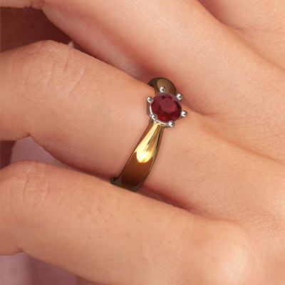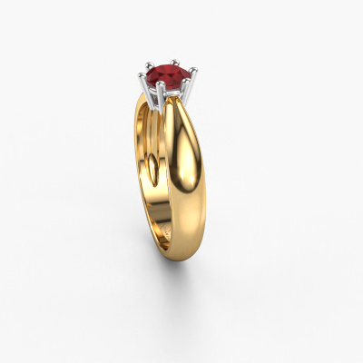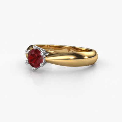The ring shown above is called the Fay, we call this a solitaire ring because it contains a single gemstone. The engagement ring is made in 14 Carat gold and has a round ruby of 5 mm. This traditional gold solitaire ring with exquisite round ruby is a beautiful engagement ring. The open prong setting allows light to strike the gemstone from various angles. The ring also stands out because of the high positioning of the gemstone. Because diamonds symbolize true love and purity, they make the perfect gift for the love of your life. The symbol of eternal love is the centerpiece of this solitaire ring. Like a diamond, all other types of precious metal have their own attributed symbolic meaning. You can compile the solitaire engagement ring yourself in various precious metal combinations. This one has the combination of 14 Carat gold with white gold. Each piece of jewelry is made just for you by our master goldsmiths in our own studio.By using a combination of the latest modern techniques, combined with ancient crafting, we can make all our engagement rings in our own studio. Each jewel is made to order. This is advantageous because we can offer you a price you won't find anywhere else.Have you found a specific engagement ring somewhere which you would like to give to your loved one? Please feel free to express your wishes to our jewel designers because we would be honoured to turn your design into a traditional engagement ring. You can follow the development of your ring design because we use 3D drawings. This gives you a realistic preview of how your design will look. You can also preorder a dummy. A dummy is a plastic ring, which can be shaped according your ring design. You can try it on and check if its width and size are suitable for you. We will gladly send you a non-binding offer, based on a fair price/ quality ratio. It will amaze you, considering the quality of the ring and gemstones.To make it easier for you, we offer a 30 day return policy. Check our terms and conditions.