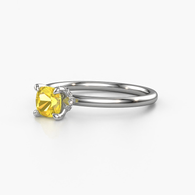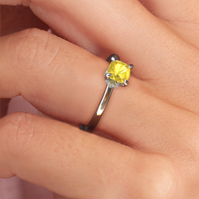 The ring shown above is called the Crystal CUS 3, we call this a solitaire ring because it contains a single gemstone. The engagement ring is made in platinum and has a cushion yellow sapphire of 5 mm. This fashionable platinum solitaire ring with exquisite cushion yellow sapphire is a beautiful engagement ring. The open prong setting allows light to strike the gemstone from various angles. The ring also stands out because of the high positioning of the gemstone. Because diamonds symbolize true love and purity, they make the perfect gift for the love of your life. The symbol of eternal love is the centerpiece of this solitaire ring. Like a diamond, all other types of precious metal have their own attributed symbolic meaning. You can compile the solitaire engagement ring yourself in various precious metal combinations. This one has the combination of platinum with platinum. Each piece of jewelry is made by a team of passionate goldsmiths and jewel designers. This will make your crown jewel truly eye-catching.By using a combination of the latest modern techniques, combined with ancient crafting, we can make all our engagement rings in our own studio. Each jewel is made to order. This is advantageous because we can offer you a price you won't find anywhere else.Our designers and goldsmiths work together each day, creating new jewels. Perhaps you have found a nice fashionable engagement ring somewhere, which can be used to customize your unique ring. Please feel free to contact us. We will make you an offer, based on a fair price/ quality ratio, which will amaze you.To make it easier for you, we offer a 30 day return policy. Check our terms and conditions.