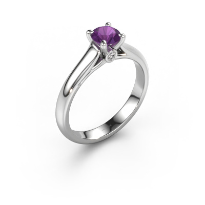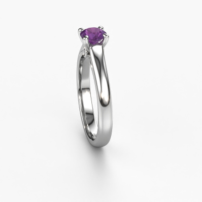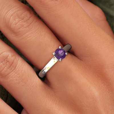 The ring shown above is called the Valorie RND 1, we call this a solitaire ring because it contains a single gemstone. The engagement ring is made in platinum and has a round amethyst of 5 mm. This modern platinum solitaire ring with exquisite round amethyst is a beautiful engagement ring. The open prong setting allows light to strike the gemstone from various angles. The ring also stands out because of the high positioning of the gemstone. Because diamonds symbolize true love and purity, they make the perfect gift for the love of your life. The symbol of eternal love is the centerpiece of this solitaire ring. Like a diamond, all other types of precious metal have their own attributed symbolic meaning. You can compile the solitaire engagement ring yourself in various precious metal combinations. This one has the combination of platinum with platinum. Each piece of jewelry is made just for you, with attention to detail and design.By using our modern techniques, we can design and customize the finest quality jewels with the utmost care for you. Our engagement rings are always priced 30 percent lower than other jewellers. We make engagement rings to order so we don't have to maintain a large stock. If you have a certain budget, we are more than happy to advice you accordingly.Do you have a specific ring in mind? One you came across somewhere. Please feel free to tell us your wishes and we will turn your design into a unique engagement ring. You can follow the development of your ring design because we use 3D drawings. This gives you a realistic preview of your design. We will gladly send you a non-binding offer, based on a fair price/ quality ratio. It will amaze you.To make it easier for you, we offer a 30 day return policy. Check our terms and conditions.