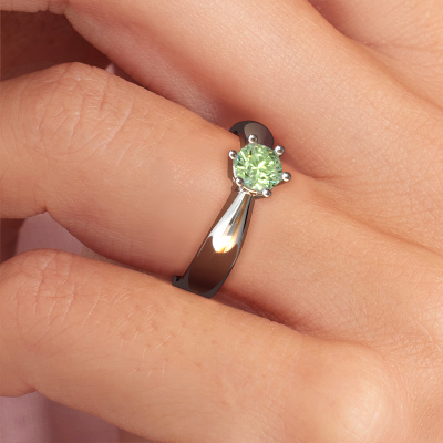The ring shown above is called the Fay, we call this a solitaire ring because it contains a single gemstone. The engagement ring is made in platinum and has a round green lab grown diamond of 5 mm. This traditional platinum solitaire ring with exquisite round green lab grown diamond is a beautiful engagement ring. The open prong setting allows light to strike the gemstone from various angles. The ring also stands out because of the high positioning of the gemstone. Because diamonds symbolize true love and purity, they make the perfect gift for the love of your life. The symbol of eternal love is the centerpiece of this solitaire ring. Like a diamond, all other types of precious metal have their own attributed symbolic meaning. You can compile the solitaire engagement ring yourself in various precious metal combinations. This one has the combination of platinum with platinum. Each piece of jewelry is made just for you by our master goldsmiths in our own studio.By using a combination of the latest modern techniques, combined with ancient crafting, we can make all our engagement rings in our own studio. Each jewel is made to order. This is advantageous because we can offer you a price you won't find anywhere else.Have you found a specific engagement ring somewhere which you would like to give to your loved one? Please feel free to express your wishes to our jewel designers because we would be honoured to turn your design into a traditional engagement ring. You can follow the development of your ring design because we use 3D drawings. This gives you a realistic preview of how your design will look. You can also preorder a dummy. A dummy is a plastic ring, which can be shaped according your ring design. You can try it on and check if its width and size are suitable for you. We will gladly send you a non-binding offer, based on a fair price/ quality ratio. It will amaze you, considering the quality of the ring and gemstones.To make it easier for you, we offer a 30 day return policy. Check our terms and conditions.