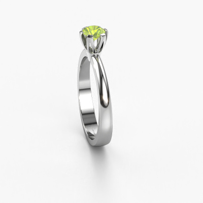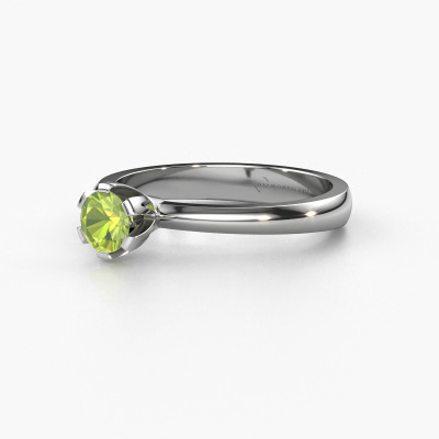 The ring shown above is called the Julia, we call this a solitaire ring because it contains a single gemstone. The engagement ring is made in platinum and has a round peridot of 4 mm. This trendy platinum solitaire ring with exquisite round peridot is a beautiful engagement ring. The open prong setting allows light to strike the gemstone from various angles. The ring also stands out because of the high positioning of the gemstone. Because diamonds symbolize true love and purity, they make the perfect gift for the love of your life. The symbol of eternal love is the centerpiece of this solitaire ring. Like a diamond, all other types of precious metal have their own attributed symbolic meaning. You can compile the solitaire engagement ring yourself in various precious metal combinations. This one has the combination of platinum with platinum. Each piece of jewelry is created to add sparkle to your finger, each jewel is lovingly made by hand by our goldsmiths.Are you on a budget? Please feel free to contact us, so we can go discuss your options. We offer our engagement rings at guaranteed best price, because we make them to order. You won't find such a price anywhere else!Different styles of new rings are made daily by our team. Perhaps you have found a solitaire engagement ring somewhere. One you would like to give to your loved one. Please feel free to share your thoughts and design with our jewel designers. We would love to turn your design into a trendy engagement ring. You can follow the development of your ring design because we use very detailed 3D drawings. On top of that, you can order a dummy of the design. A dummy is a plastic ring, which can be shaped according your ring design. You can try it on and check if the engagement ring is up to standard. We will gladly send you a non-binding offer, based on a fair price/ quality ratio. The offer will baffle you, considering the quality of the ring and gemstones.To make it easier for you, we offer a 30 day return policy. Check our terms and conditions.